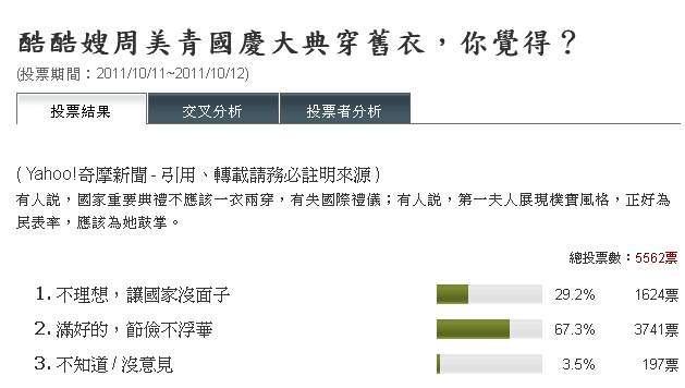 網 友意見分歧,有人力挺周美青做自己,不認同穿著一定要華貴,網友SinosaiAg表示「認為不能穿同件衣服的人真膚淺」。也有人直言「第一夫人代表大家 的面子」,重要節日不應穿舊衣,網友Prius更表示「振興經濟是喊給其他人聽的」,多數網友支持周美青穿舊衣的典範,但卻不支持「去年國慶衣服與今年一 樣」。